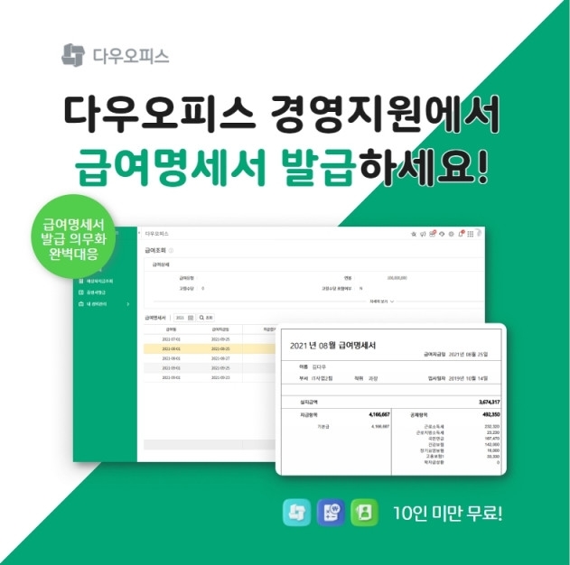 특히 다우오피스 경영 지원은 총 근무 일수, 근로 시간, 휴가 등의 정보도 추가 기재할 수 있도록 근로시간 설정 및 관리 기능이 제공된다. 이 밖에도 임금 명세서 교부 의무화에 대비할 수 있도록 △사원별 급여 관리 △급여 명세서 조회 △급여 대장 작성 △법정 수당 산식 생성 △지급 및 공제 항목 관리 기능을 제공한다.