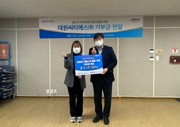 대원씨티에스 하성원 대표는 “우리의 마음을 담은 기부금이 코로나19와 추운 날씨로 힘든 시간을 보내고 있는 용산구 지역 어르신에게 조금이나마 도움이 되기를 바란다”며 “앞으로도 취약계층 지원, 지역사회와의 상생 등 사회적 책임을 다하기 위해 더욱 노력하겠다”고 말했다.
