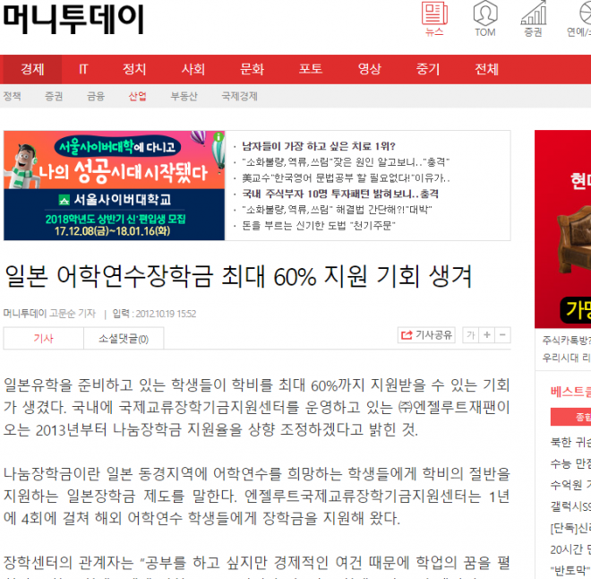 일본유학을 준비하고 있는 학생들이 학비를 최대 60%까지 지원받을 수 있는 기회가 생겼다. 국내에 국제교류장학기금지원센터를 운영하고 있는 ㈜엔젤루트재팬이 오는 2013년부터 나눔장학금 지원율을 상향 조정하겠다고 밝힌 것.