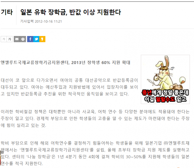 학비 부담으로 인해 해외 어학연수를 결정하기 힘들어하는 학생들을 위해 일본기업 ㈜엔젤루트재팬에서는 ‘엔젤루트국제교류장학기금지원센터’를 설립, 올해 초부터 장학금 지원 제도를 실행하고 있다. 센터의 ‘나눔 장학금’은 1년 4분기 동안 4회에 걸쳐 학비의 30~50%를 지원해 학생들의 일본 연수를 적극 지원한다.
