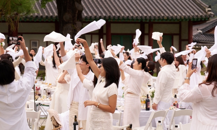 이번 행사 역시 디네앙블랑의 시그니처 세레머니인 ‘냅킨 웨이브’로 그 막을 올렸다. 한국의 전통미를 자랑하는 전주향교에는 화이트로 우아하고 화려하게 갖춰 입은 참가자들이 일으킨 순백의 물결로 유례없는 이색 장관이 펼쳐졌다.