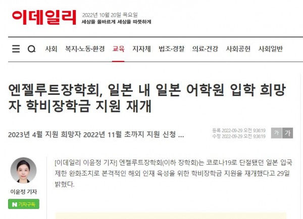 한편 엔젤루트장학회는 2012년부터 해외진출 기회를 모색하는 대한민국 청년들에게 동등한 능력개발의 기회 제공을 목적으로 일본 내 일본 어학원에 입학을 준비하는 청년들에게 학비장학금을 학기마다 지원하는 비영리공익법인이다.